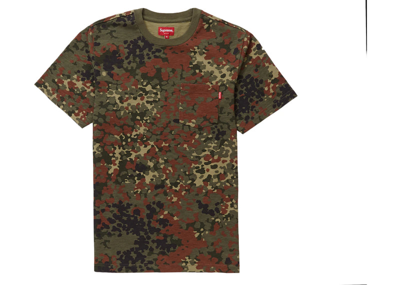 The Supreme SS Pocket Tee (SS19) Olive German Camo is now available at Side Kicks!