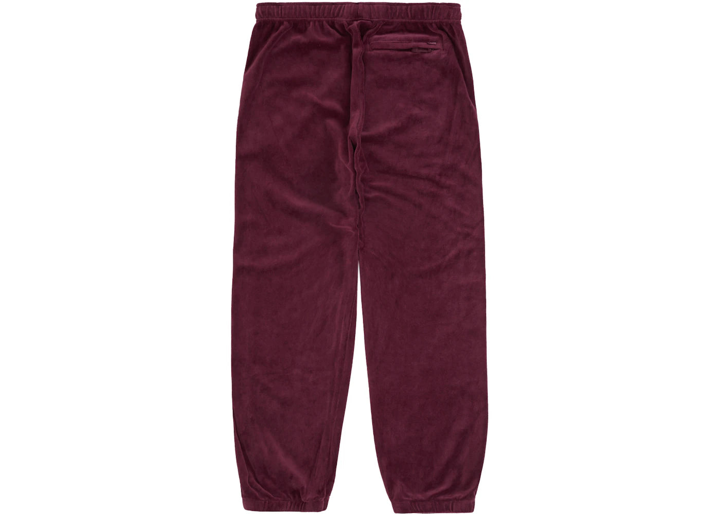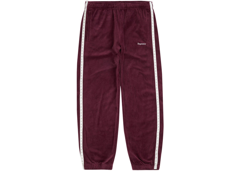The Supreme Studded Velour Track Pant Burgundy is now available at Side Kicks!