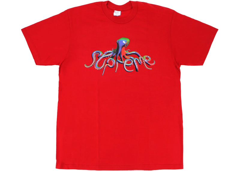 The Supreme Tentacles Tee Red features a short-sleeve cotton jersey construction in red with a full-color octopus graphic on the front. The design incorporates twisting tentacles forming the Supreme logo, highlighted by white suckers. Supreme’s signature red box branding appears on the interior collar label.