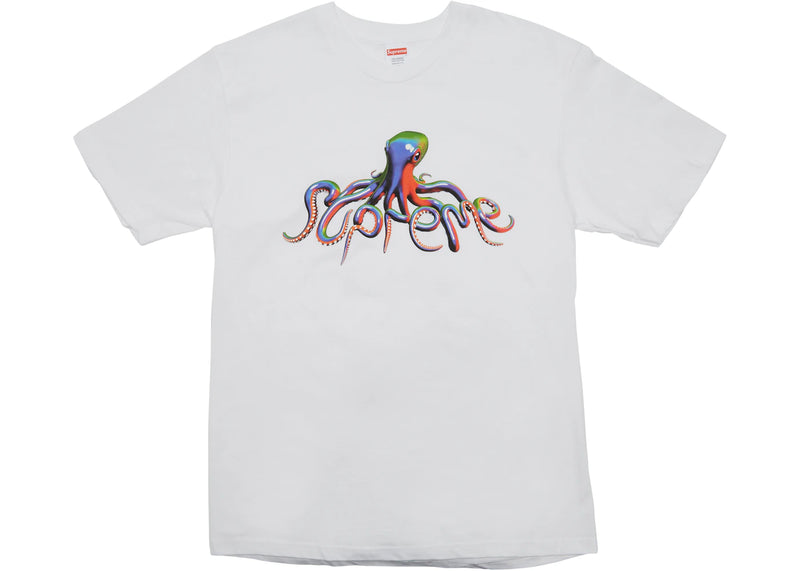 The Supreme Tentacles Tee Red is a short-sleeved cotton jersey tee featuring a full-color octopus graphic on the front. The design incorporates twisting tentacles that form the Supreme logo, highlighted by white suckers. The interior collar includes the brand's signature red woven label.