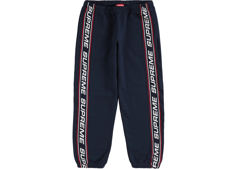 The Supreme Text Rib Sweatpant Navy is now available at Side Kicks!