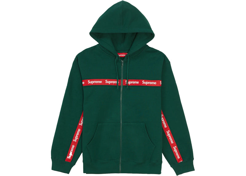 The Supreme Text Stripe Zip Up Hooded Sweatshirt Dark Green is now available at Side Kicks!