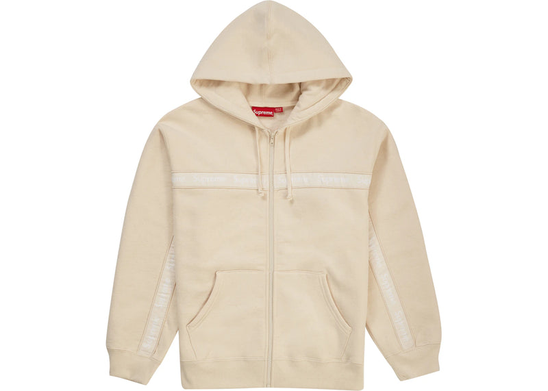 The Supreme Text Stripe Zip Up Hooded Sweatshirt Natural is now available at Side Kicks!