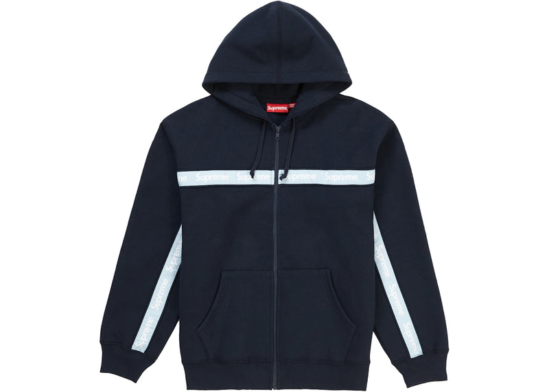 The Supreme Text Stripe Zip Up Hooded Sweatshirt Navy is now available at Side Kicks!