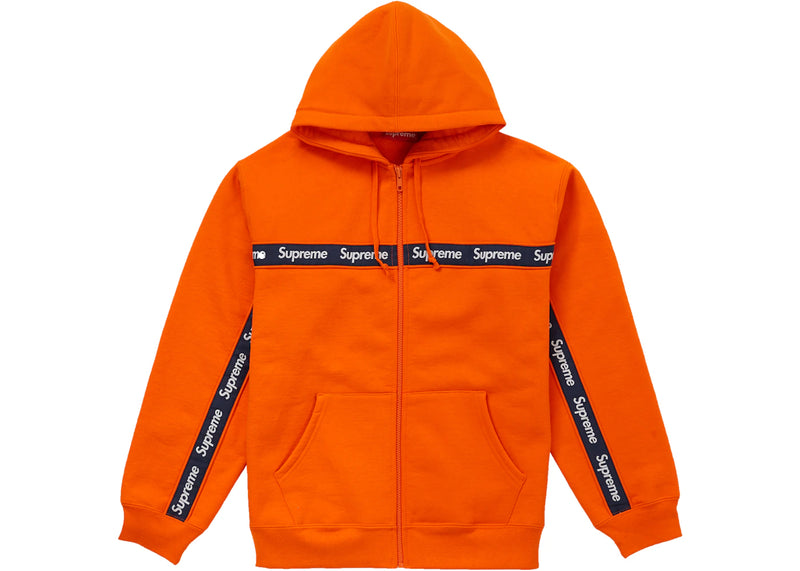 The Supreme Text Stripe Zip Up Hooded Sweatshirt Orange is now available at Side Kicks!
