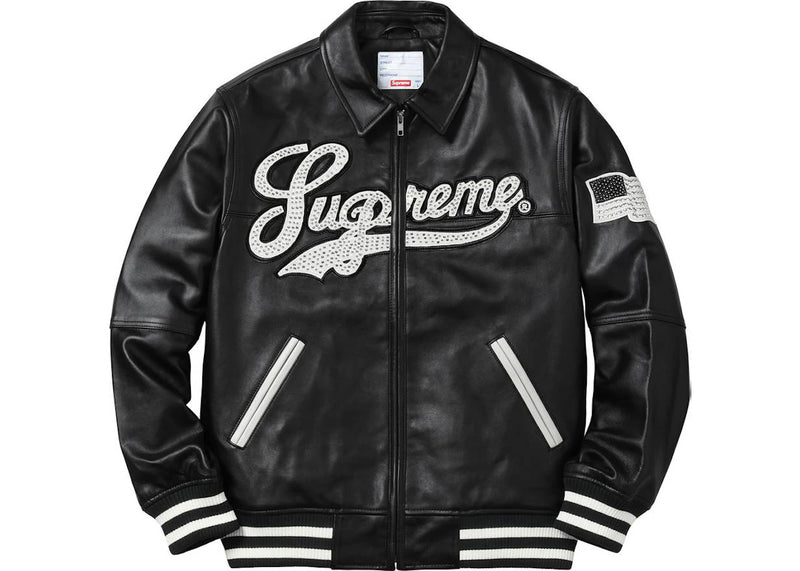 The Supreme Uptown Studded Leather Varsity Jacket Black is now available at Side Kicks!