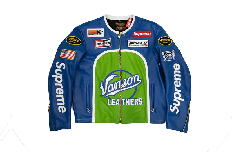 The Supreme Vanson Leather Star Jacket Royal is now available at Side Kicks!