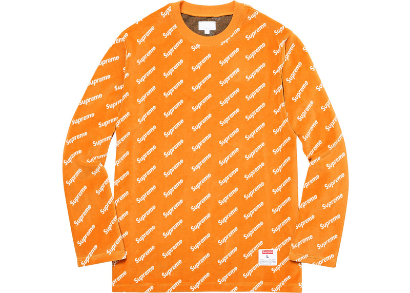 The Supreme Velour Diagonal Logo L/S Top Marigold is now available at Side Kicks!