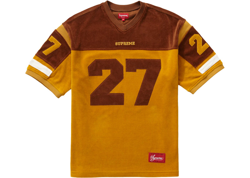 The Supreme Velour Football Jersey Mustard is now available at Side Kicks!