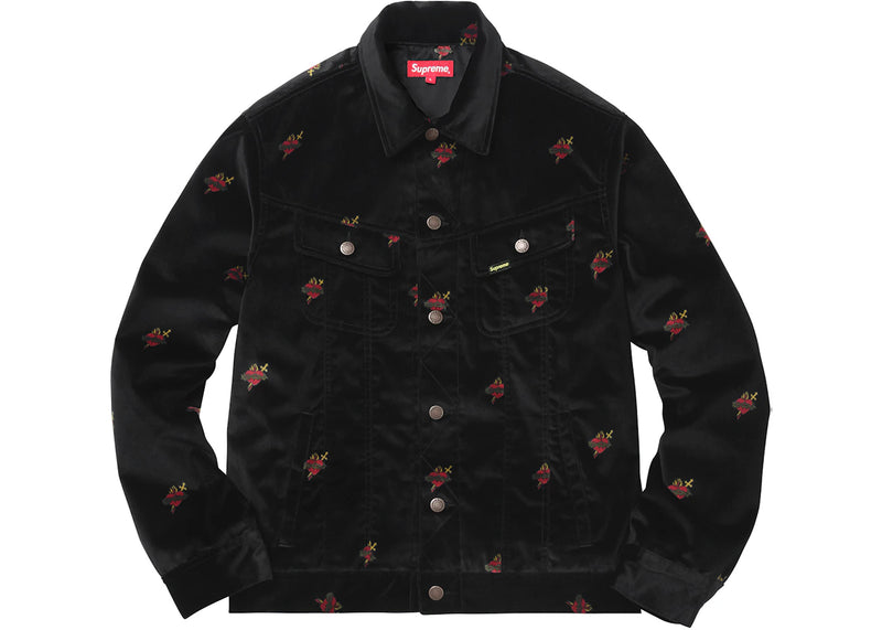 The Supreme Velvet Trucker Jacket Black Sacred Hearts is now available at Side Kicks!
