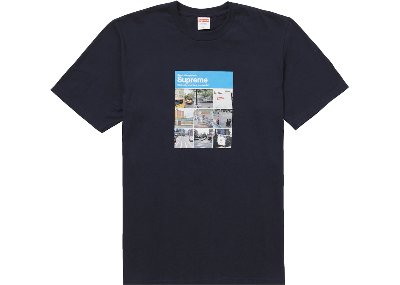 The Supreme Verify Tee Navy is a short-sleeve cotton crewneck t-shirt with a straight hem. It features a printed graphic of an internet security verification screen, displaying the text "Select all images with Supreme" above nine framed images. The design mimics online CAPTCHA prompts. Released on August 20, 2020, the Supreme Verify Tee Navy is available now at Side Kicks.