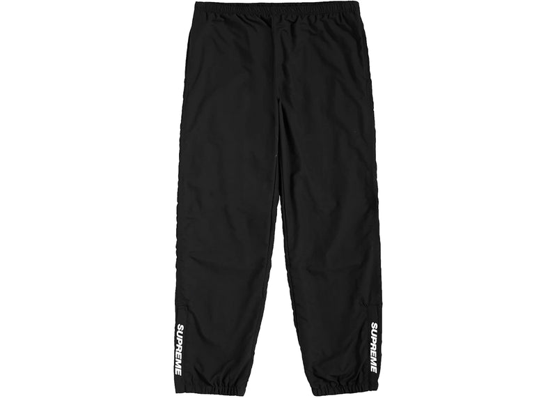 The Supreme Warm Up Pant (SS18) Blue Camo features an elasticated waistband and cinched cuffs with Supreme branding on Velcro-sealed ankle slits. The design includes a single zipper pocket at the back for small items and offers a comfort cut for flexibility. Made with a blue, grey, and black camo pattern, these sweatpants provide a utilitarian style. Released on May 17, 2018, the Supreme Warm Up Pant (SS18) Blue Camo is available now at Side Kicks.