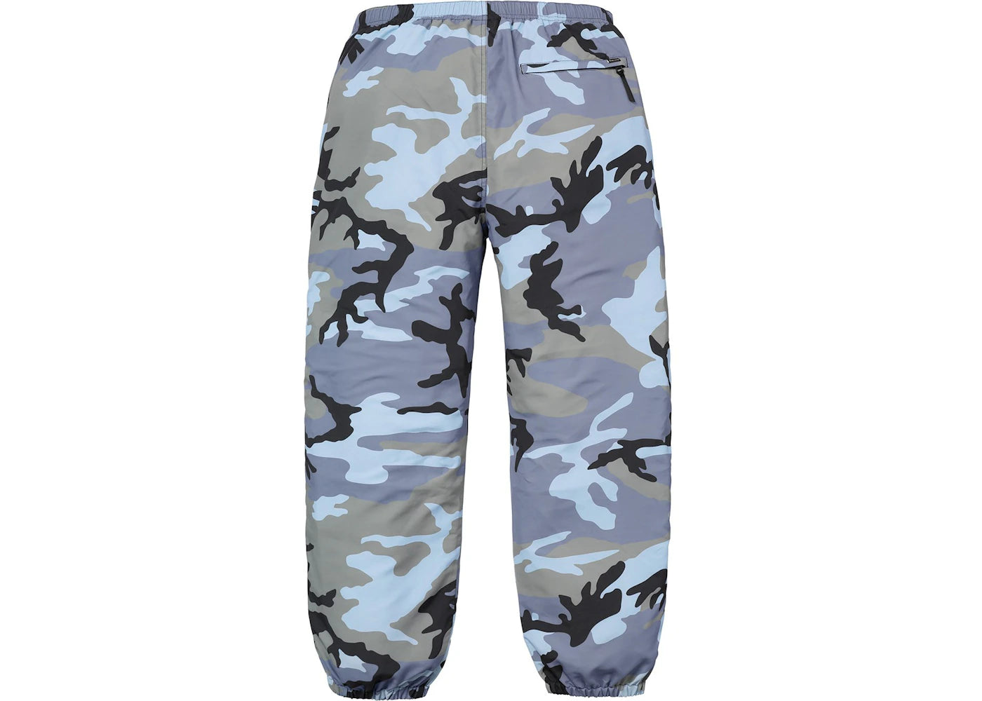The Supreme Warm Up Pant (SS18) Blue Camo features an elasticated waistband and cinched cuffs with Supreme branding on Velcro-sealed ankle slits. It includes a single zipper pocket at the...