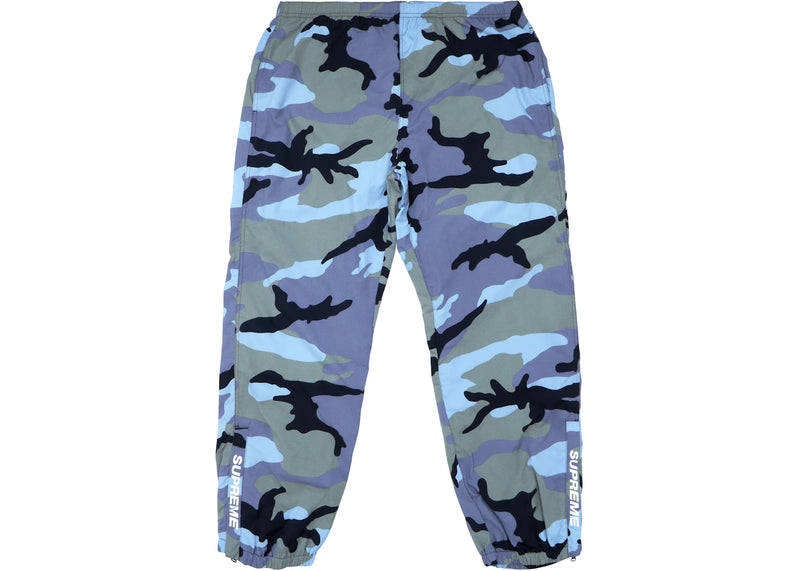 The Supreme Warm Up Pant (SS18) Blue Camo features an elasticated waistband and cinched cuffs with Supreme branding on Velcro-sealed ankle slits. It includes a single zipper pocket at the back for storage. The comfort-cut design provides flexibility with a blue, grey, and black camo pattern. Released on May 17, 2018, the Supreme Warm Up Pant (SS18) Blue Camo is available now at Side Kicks.