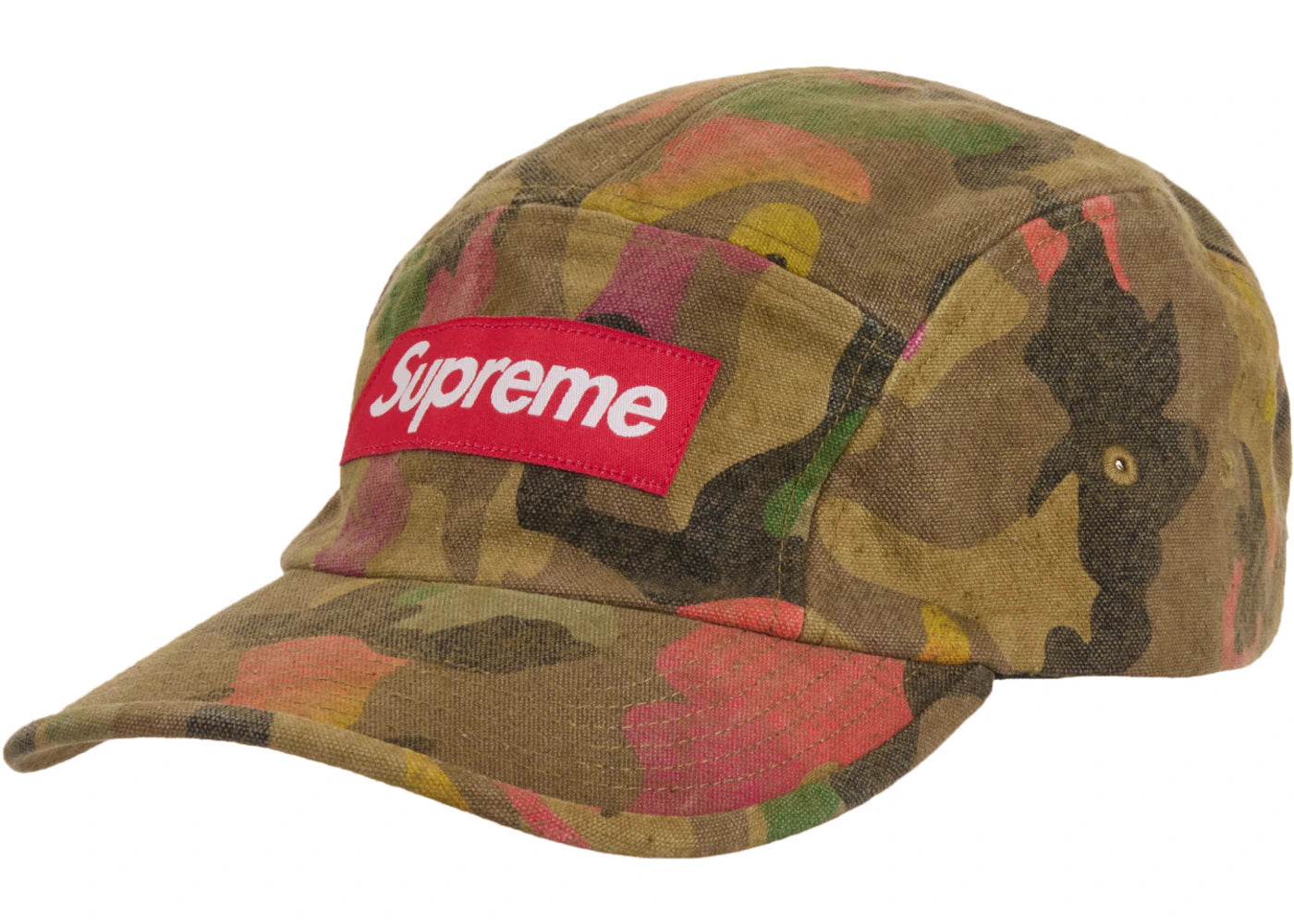 The Supreme Washed Canvas Camp Cap (SS24) Tan Camo is now available at Side Kicks!