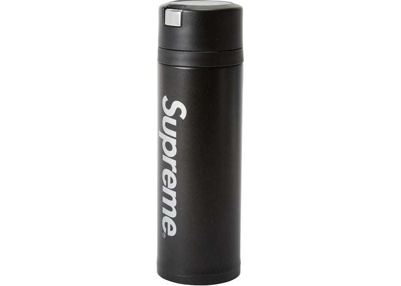 The Supreme x Zojirushi Stainless Steel Black Mug features vacuum insulation and an easy-open lock. It maintains cold liquids for 24 hours and hot liquids for 12 hours. The 450ml capacity mug has an all-black design with a gray Supreme logo on the front. Released on November 16, 2017, the Supreme x Zojirushi Stainless Steel Black Mug is available now at Side Kicks.