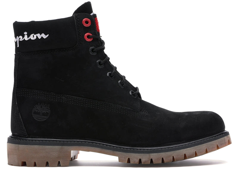 The Timberland 6" Boot Champion Black features a waterproof full-grain leather upper in all-black. It includes Timberland and Champion branding, with the latter's large "C" logo on the tongue and script lettering on the collar. Colorful laces and red eyelets add distinctive detailing.