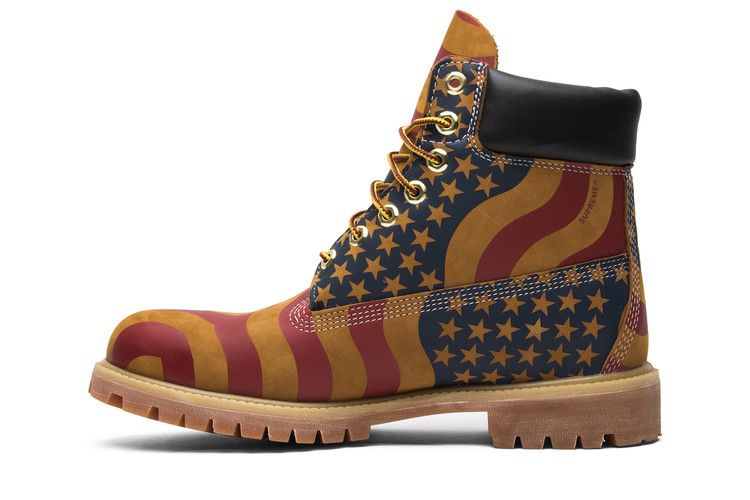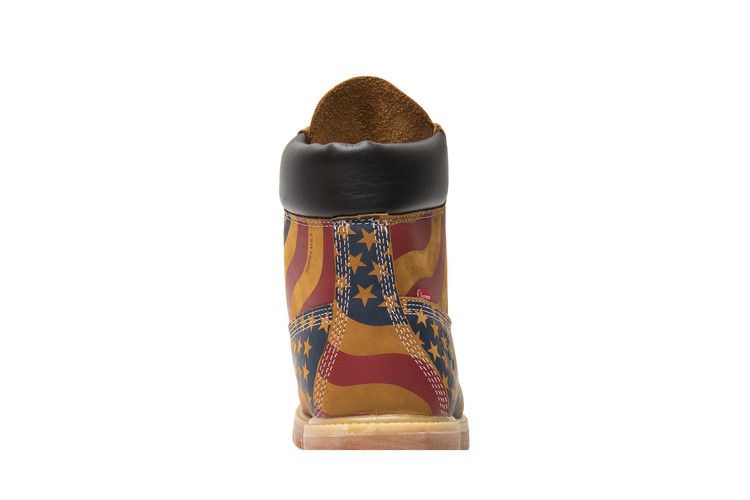 The Timberland 6" Boot Supreme Stars & Stripes Wheat features a waterproof wheat nubuck upper with red stripes and navy blue star detailing. It includes a black leather padded collar,...