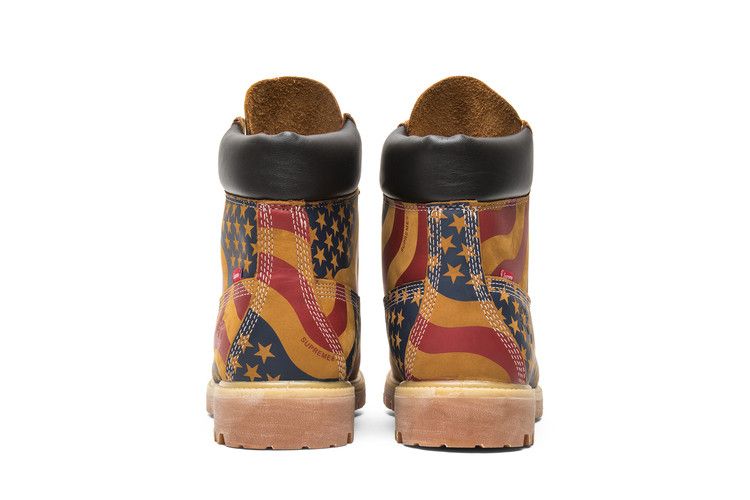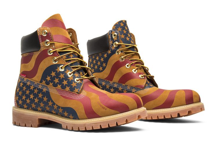 The Timberland 6" Boot Supreme Stars & Stripes Wheat features a waterproof wheat nubuck upper with red stripes and navy blue star detailing. It includes a black leather padded collar, silver eyelets, and a lugged gum rubber outsole for traction. The laces combine yellow and brown for a classic look. Released on November 24, 2017, the Timberland 6" Boot Supreme Stars & Stripes Wheat is available now at Side Kicks.