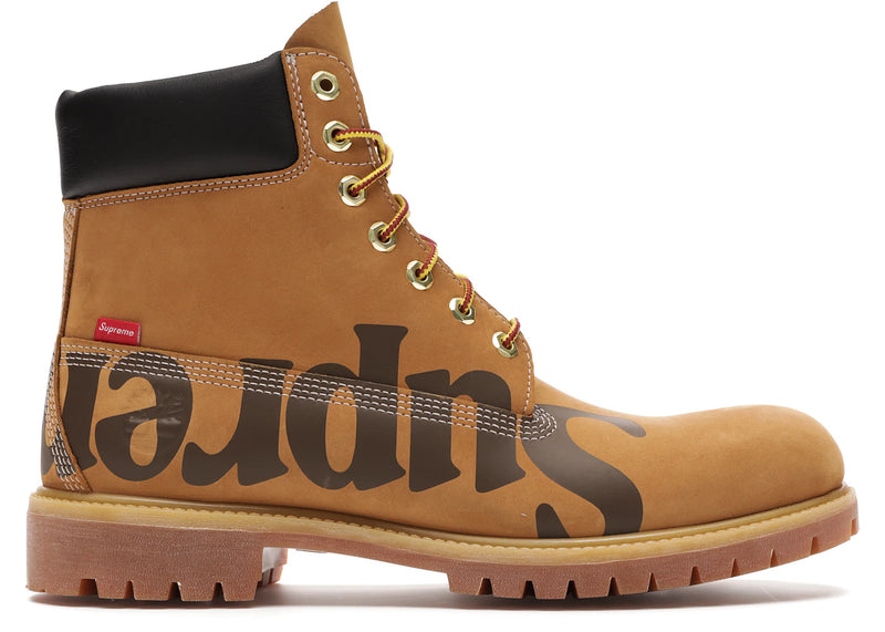 The Timberland 6" Supreme Wheat has a Wheat nubuck and leather upper, with brown nubuck as the primary material. It includes an oversized tree logo, Supreme box logo, and large...