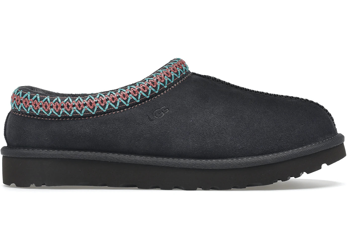 The UGG Tasman Slipper Dark Grey W features a suede upper with a center seam, rounded toe, and lateral branding. The cuff includes colorful Tasman braiding, while the lining uses 17mm sheepskin and an UGGplush wool insole. A sunburst-patterned sole with a Treadlite coating works for indoor or outdoor use.