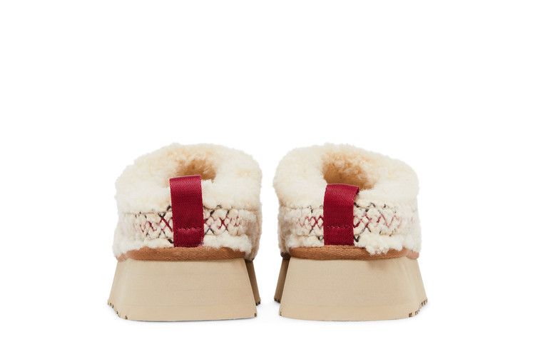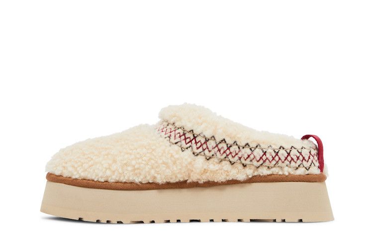 The UGG Tazz Slipper Heritage Braid Natural (Women's) features a soft, curly sheepskin upper in a neutral hue, replacing the traditional suede. Red and black stitching creates a Tasman braid embroidery along the sheepskin collar, while a glossy red pull tab adds convenience. The plush lyocell sock liner ensures comfort, and the insole includes a woven UGG logo.