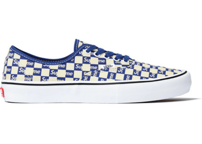 The Vans Authentic Supreme Blue Checker Logo is now available at Side Kicks!