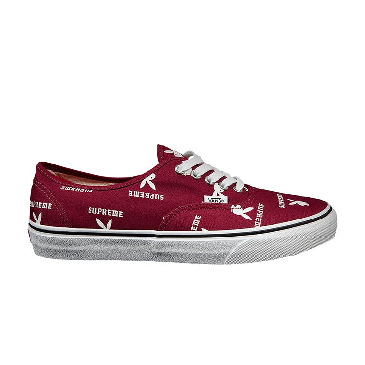 The Vans Authentic Supreme x Playboy Burgundy is now available at Side Kicks!