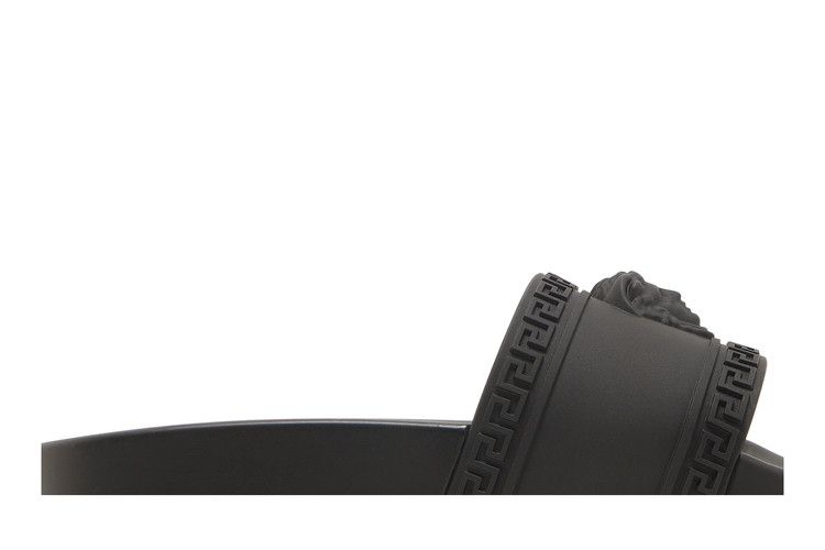 The Versace Palazzo Slides Black is a classic pool slider made in Italy. It features a black rubber construction with a molded footbed for comfort and a textured insole. The wide strap upper includes three-dimensional detailing with a Medusa head and Greco borders. The rubber midsole and grooved outsole provide cushioning and non-slip grip, both embossed with Versace branding. Released on December 3, 2021, the Versace Palazzo Slides Black is available now at Side Kicks.