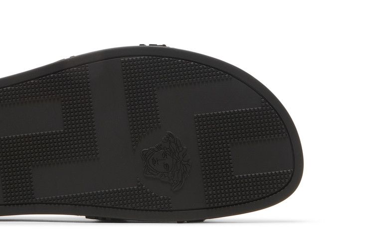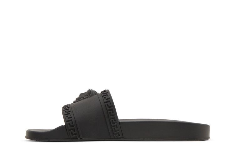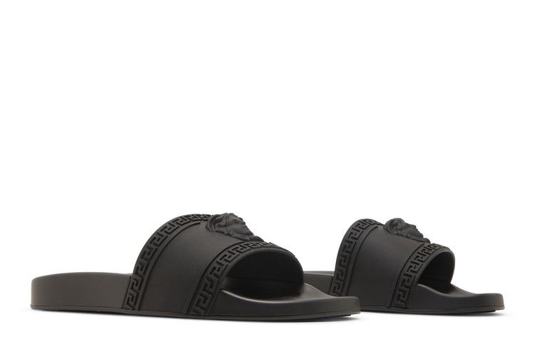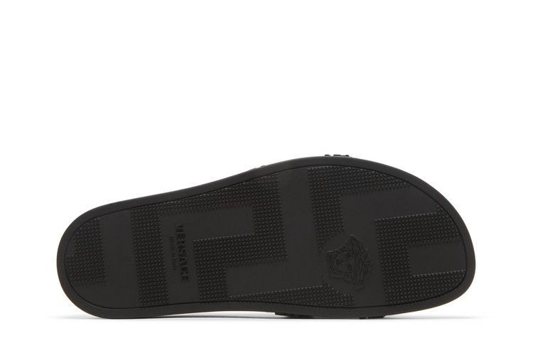 The Versace Palazzo Slides Black is a classic pool slider made in Italy. It features a black rubber construction with a molded footbed for comfort and a textured insole. The...