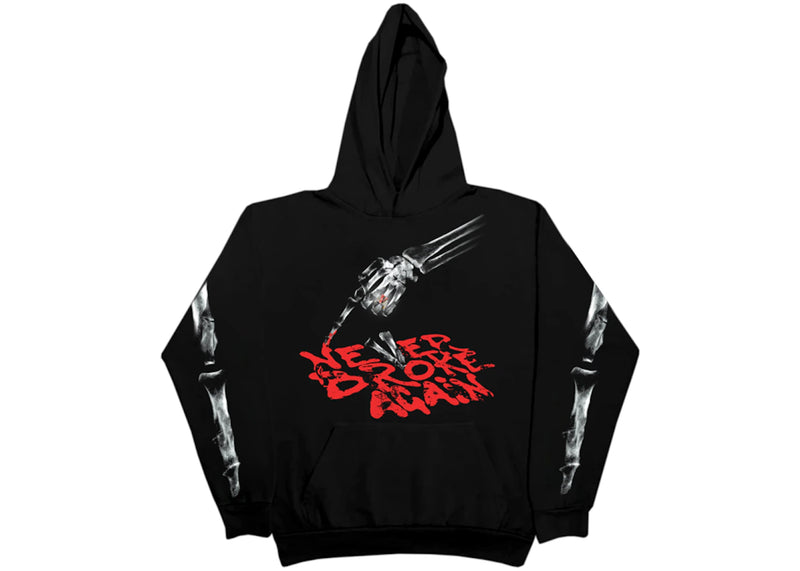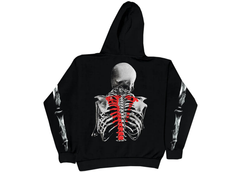The Vlone x Never Broke Again Bones Hoodie Black is a black long-sleeved hoodie with a skeleton arm graphic and red Never Broke Again text on the front. The back...
